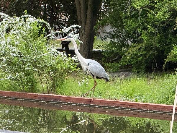 池の周りには色づいた樹木とともに、時には大きな鳥(アオサギかと思います)が来ます。