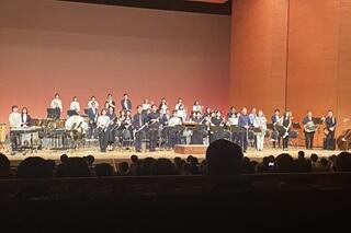 第Ⅱ部の前半は本校ブラスバンド部OBで構成するOBバンドによる「黒いジャガーのテーマ」、「吹奏楽のための『風之舞』」、「ジェラート・コン・カフェ」の3曲の演奏がありました。本校のOBではありませんが、ブラスバンド部顧問の長谷川教諭も楽しそうにクラリネットを吹いていました。1曲めの「黒いジャガーのテーマ」はテンポよくノリのよい曲であり、指揮者は飛び跳ね、演奏者も曲にあわせて活き活きと楽しく演奏されていたのが印象的でした。2曲めは「浮世絵」の持つ独特の表現や世界観をイメージした曲、3曲めはアイスクリームにエスプレッソをかけたイタリアのデザートをイメージした曲とのことで、それぞれ趣の異なる曲でした。こうして高校生が部活の先輩と交流できる機会があることに感謝します。OBバンドの皆様、どうもありがとうございました。