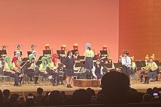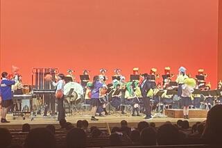 第Ⅱ部の後半には、定期演奏会恒例の「岸高オリジナルメドレー」が演奏されました。1年生部員が演じる劇や踊りにあわせて、2,3年生が誰もが聞いたことのある曲を演奏していきます。