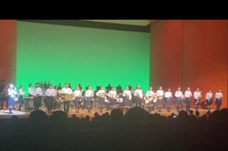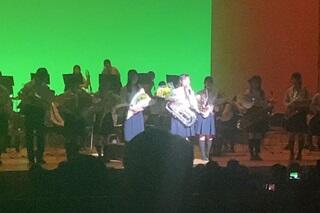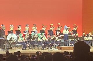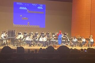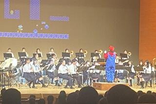 第Ⅲ部の1曲めはイギリスのロックバンド「ディープ・パープル」のヒット曲で構成された「ディープ・パープル・メドレー」でした。指揮者であるブラスバンド部顧問の北本教諭がサングラスをかけ、曲が始まりました。この曲では部員も全員サングラスをかけていました。「ディープ・パープル・メドレー」は私たちの世代にとってはとても懐かしい曲ばかりでした。2曲めは大人気ゲームシリーズの元祖である「スーパーマリオブラザーズ」のBGMがメドレーで演奏されました。学生指揮の奥山さんがマリオの衣装で指揮をするとともに、舞台正面のスクリーンにはゲームの画面が映し出されるという演出もありました。