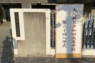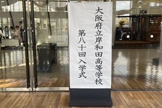 当日は私が13:30の開場前に浪切ホールに到着すると、すでにたくさんの方が来られており、「大阪府立岸和田高等学校第八十回入学式」と書いた看板の前で写真を撮影されていました。順番待ちで並ばれているような状況でした。