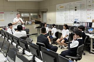 当日は15:20から会議室において開催された「サイエンスカフェ」に寄ってから行ったところ、ネイティブの教員と8名の生徒が椅子に座り、生徒たちは4組のペアに分かれて英語による会話をしていました。その後、一人ひとりが全体に対してペアであった相手の紹介を英語で共有していきました。それを聞いて、ペアで互いに自己紹介していたことが分かりました。