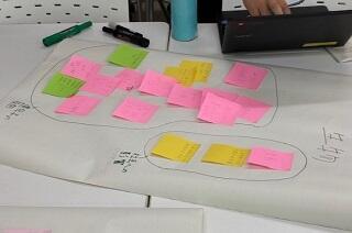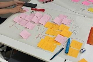 その全体講義の後、参加生徒たちは興味・関心に基づき、分野ごとにグループに分かれて、探究のテーマを決めていく活動に移りました。それぞれのグループには、大学の教員や大学生などにも入っていただいています。生徒たちは関心のある「課題」に対する具体的な「問題」を付箋に書いて、整理・分類しながら模造紙に貼っていき、議論を重ねてテーマを絞っていました。本日は16:00まで続きます。しっかりと話し合って自分たちの研究テーマを決定してください。