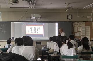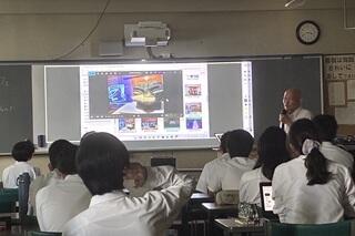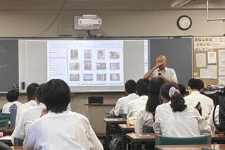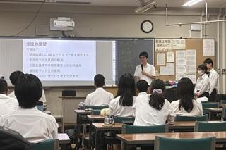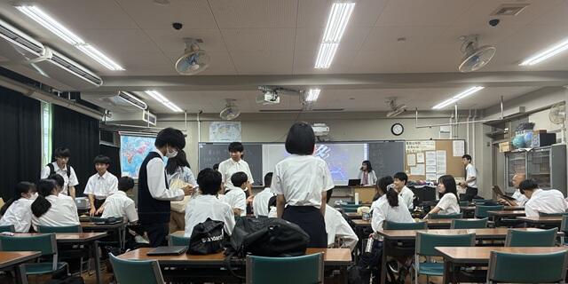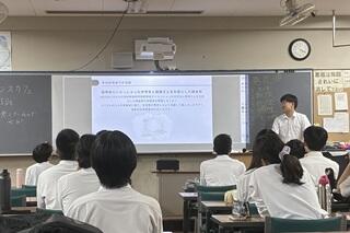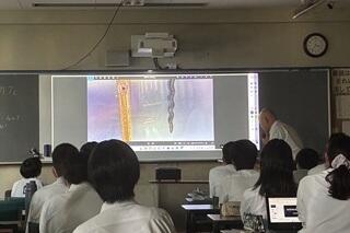 私が15:20に行くと、すでに多くの生徒が集まっていました。この日は各部からの活動内容などの発表の前に、第1部として、本校の理科の教員から、「大阪・関西万博」に関する報告がありました。教員としての豊富な経験と、生物分野における専門的な幅広く深い知識を持つ、個性豊かな教員です。「大阪・関西万博」にはすでに25回訪れているそうですが、その目的は多くの人とは異なる「本物を見る」、「リアルを見る」ためだと言っていました。
