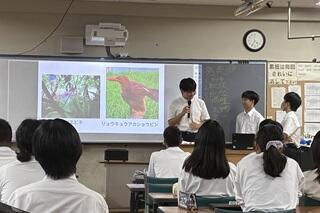 生物部からは、最初に部長の紹介がありました。生物全般にわたりとても詳しく、話しも面白い1年生でした。話す内容や楽しげな表情から、本当に生物が好きなのだろうと感じました。活動報告では、生物クイズや剥製フォトスポットなどを行った文化祭、和泉葛城山へのフィールドワーク、今回奄美大島に行った生物フィールドワーク(生物部から2名が参加)、そしてインスタグラムでの発信を強化しフォロワーが500名を超えたという報告がありました。