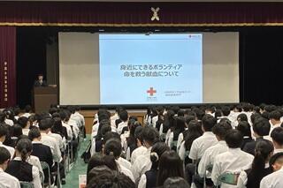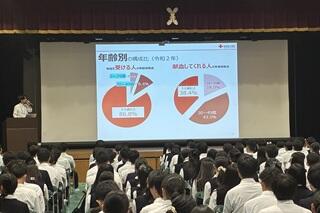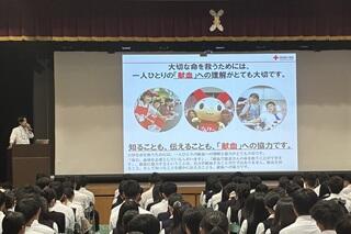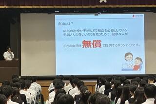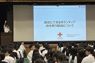 その後、大阪府赤十字血液センター南大阪事業所の方から、「身近にできるボランティア 命を救う献血について」というテーマでお話しいただきました。