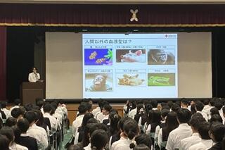 最初に、世界192の国と地域で活動する組織「赤十字社」の目的、各国の血液型人口割合や生き物の血液型などについての話しがありました。魚はほぼA型、カエルはAB型であることなど初めて知りましたが、そもそも生き物の血液の血液型について考えたことなどありませんでした。生徒たちからも様々な意味での「どよめき」が起きていました。