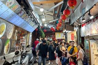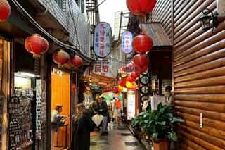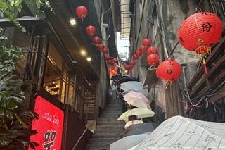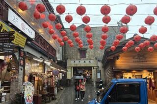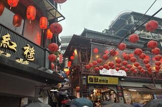 昼食後それぞれのバスに乗り込み、「九份」に向かいました。ジブリ映画の舞台になったこともあり、多くの観光客が訪れる台湾の人気スポットです。九份は山を背にし、海に面したもともと雨の多い場所にあり、やはり大雨でした。ただ、昨年度の嵐のような強風ではなかったので、私は去年よりましだなと感じました。このような天候にもかかわらず、駐車場には多くの観光バスが並び、幅の狭い階段、様々なお店が立ち並ぶ狭い通りには多くの観光客で溢れていました。