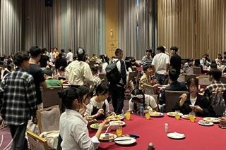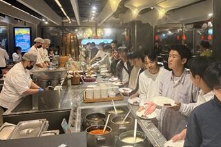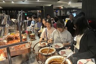 九份を出た後、夕食会場である和洋中ビュッフェのお店「饗。食天堂」に行きました。私は昨年度も行きましたが、日本では体験できないぐらいグレードの高い食べ放題のビュッフェ店です。刺身、海鮮、牛肉(ステーキ、炒め料理)、日本料理など、いかにも贅沢な食材を使った美味しそうな料理が多く並んでいるため、食べることができる量を考え、悩みながら選ぶことが楽しかったのを覚えています。デザートも充実しており、ハーゲンダッツも食べ放題です。今回も行くことができるのを密かに楽しみにしていました。初めてこの店に来た生徒たちはかなり興奮し、教員が話しをしている間も、早く料理を取りに行きたいといった様子でした。