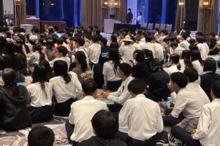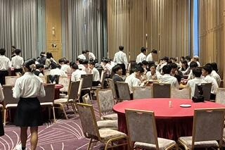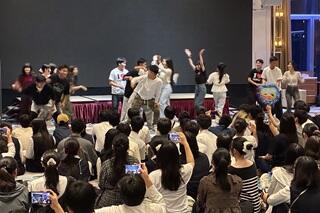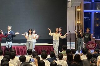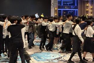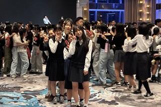 景美女子との交流を終えた後、ホテルに隣接するビル「Great Sky View」に移動し、学年レクリエーションを行いました。硬式野球部と音体部のコラボによるダンス、大じゃんけん大会、ビンゴゲーム大会などを行った後、私を除く11名の引率教員がそれぞれ個性豊かな先生役と生徒役に分かれてのコントが行われました。