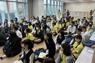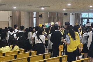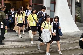 女性建築家設計による特徴的なアーチ形の正門を入ると、正面の玄関で周寤竹校長をはじめ、たくさんの教員や生徒たちが私たちを出迎えてくれていました。