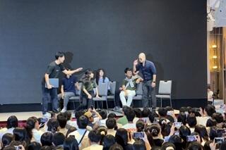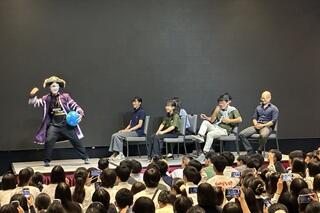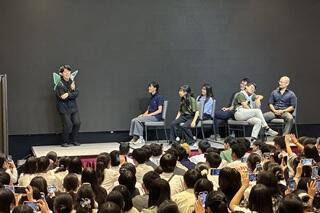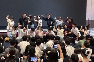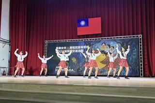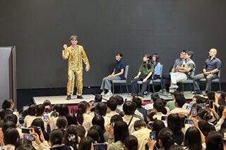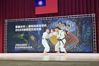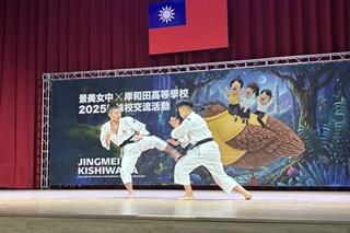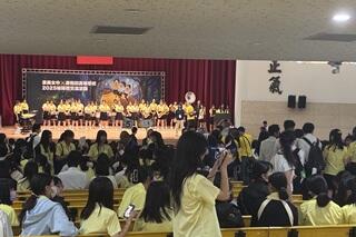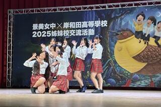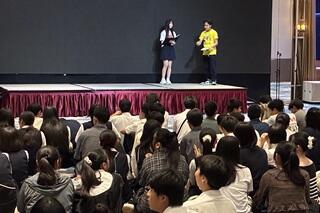 そして、景美女子の生徒による学校紹介、合唱部によるパフォーマンスが行われた後、本校生徒がパフォーマンスを行いました。本校の学校紹介の後、少林寺拳法部による演舞と音体部によるダンスを行いました。少林寺拳法部の2人は演舞の後、両校長が壇上で見本を示したうえで、会場の全員を巻き込み、護身術の実演を行いました。続いて、このパフォーマンス用の衣装に着替えた音体部2年生がAKB48「ヘビーローテーション」を披露しました。学校紹介や司会を含め、壇上に上がってくれた生徒の皆さん、どうもありがとうございました。