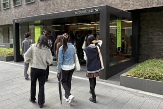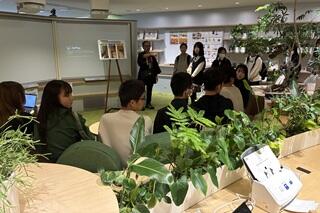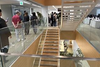 講義が終わり、全員が一緒にOsaka Metroに乗り、本町駅へ、そしてまずは御堂ビルにある竹中工務店大阪本店を訪れました。そこでは特別に、岡山教授の知り合い二人の方に一緒に回っていただき、オフィスについての説明をしていただきました。最も印象に残ったのは、速やかに移動し、直接顔をあわせて打ち合わせなどができるよう設置されたオフィス中央に位置する階段です。なだらかでとても歩きやすい階段に感動しました。これならば、階段での移動も楽しめそうだなと思いました。