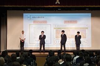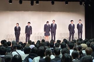 私からの挨拶の後、本校首席と生徒自治会役員が、本校の学校生活や学校行事・取組、進路指導などについて、パワーポイントを用いてプレゼンテーションを行いました。さらにその後、進行役を務めてくれた生徒自治会役員が改めて、中学生に対するメッセージの言葉を述べました。強い意志をもつことやチャレンジすることの大切さなど、それぞれに自分の思いを伝えていました。
