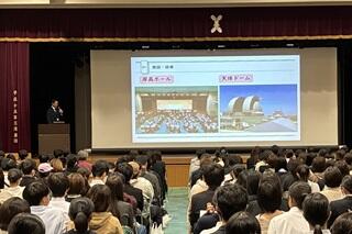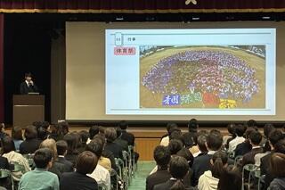 「楽しいこと」がある学校については、「中学生の時、岸和田高校は勉強ばかりのイメージだったが、入学してみたらとても楽しい」というある生徒の言葉を紹介し、「中学生の皆さんもそのようなイメージを持っていますか」と問いかけました。頷いているような様子が見られたため、やはり同じなのだろうと感じました。ただ実際には、部活動の数は府立高校で最多の45部あり、兼部を含めると95%以上の生徒が部活動に加入しています。また、学校行事も文化祭や体育祭をはじめ、生徒たちが主体的に活動し、とても活発に行われ盛り上がります。「勉強ばかりの学校ではない」ということは、生徒たちのインタビューでも十分に伝わっていたかと思います。