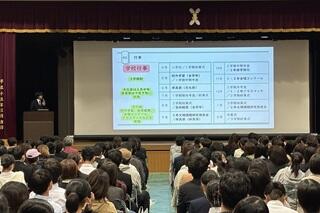 Ⅰ部は12:40、Ⅱ部は14:30から、まずは岸高ホールにおいて全体説明会を行いました。全体説明会の進行は昨年度から生徒自治会役員に任せることとし、生徒たちが活躍する場面を拡大しています。今回は会長・副会長・書記・会計の4名がⅠ部とⅡ部で役割分担を行いながら、期待どおり、立派に重責を果たしてくれました。どうもありがとうございました。