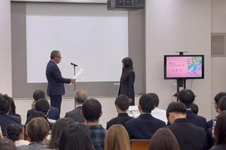 表彰状授与の後、審査委員長である大阪公立大学大学院工学研究科の荻野博康教授から講評として、「第69回大阪府学生科学賞」の審査の概要について説明がありました。今回、小学校の部100作品、中学校の部67作品、高等学校の部50作品を対象に本審査を行ったとのことです。優秀な作品が多くあり、審査が難航したという話しもありました。