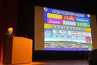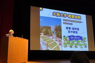 大学概要説明において、多様性・国際性豊かな大阪大学は日本屈指の研究型総合大学で、学部学生数は15,111名と国立大学最多であり、また、女子学生と海外からの留学生が多く、女子学生は全体の3割を超え、留学生は今年5月現在で2,719名であると紹介されました。
