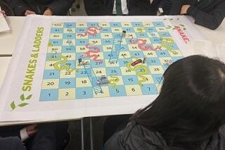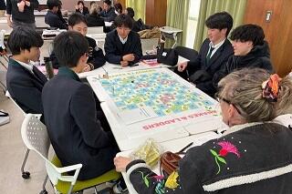 最後はボードゲームでした。サイコロをふり、出た数だけすすんでいき、ゴールの100をめざして、できる限り先まで進みましょうというゲームです。なお、止まったところに梯子があれば先まですすめたり、へびがいたら後ろに戻ったりということがあります。また、止まった番号により、それぞれ英語による質問が設定されており、その質問に回答できなければ1つ後退となります。先生方を含めて、皆がゲームを楽しみながらも、英語で出された質問に対して英語で答えていました。