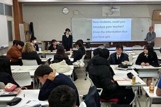 14:10から始まる6限の時間帯には、2年7組の英語の授業に参加してもらいました。生徒たちは5つのグループに分かれ、先生方にはそこにお一人ずつ入っていただきました。まずは先生方から英語で自己紹介をしていただき、生徒たちはそれをメモし、各グループの代表がそのメモをもとに全体で共有するという活動が行われました。その後、生徒たちが英語で自己紹介を行いました。