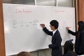 最初は「英語のしりとり」でした。最後のアルファベットで始まる単語を書くというだけではなく、それを絵で表現することも課せられていました。できる限り、絵に描きやすい単語を思い浮かべなければならないということです。どのグループも素早くつなげていき、接戦になりました。