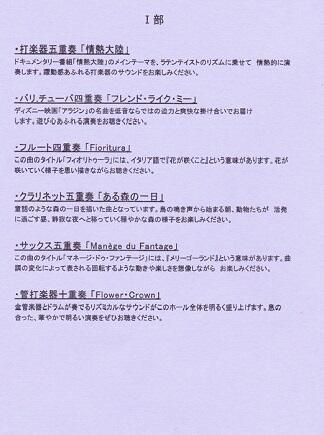 今回のコンサートは「アンサンブルコンサート」として、4人から10人で構成する計12のグループがⅠ部とⅡ部に分かれて、同じ楽器による重奏や、管打楽器が集まっての重奏を行いました。演奏した曲は以下のとおりです。