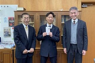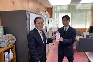 相良くんの全国大会出場に対する激励とお祝いのために、本校同窓会の岸本敬仁会長にご来校いただきました。岸本会長にはお忙しい中、お越しいただき、ありがとうございました。