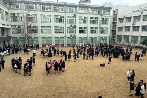 浪切ホールでの式終了後、生徒たちは学校に移動し、各教室にて最後のホームルームを行いました。いよいよお別れとなります。ただ、ホームルーム終了後も、別れを惜しむ生徒たちがたくさん中庭に集まってきました。文化祭のときもそうでした。特に打ち合わせもしていないのでしょうが。午後2時半ごろまで、多くの卒業生で賑わっていたように思います。