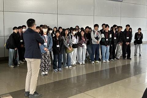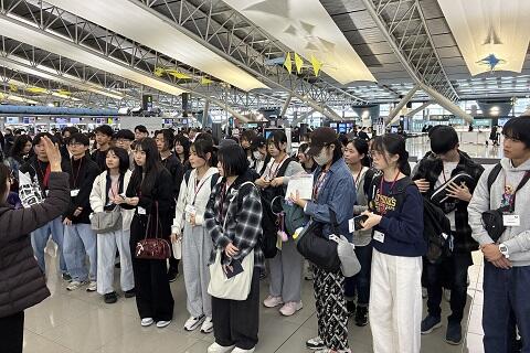 その後、研修担当者からの同行してくれる添乗員2名の紹介、添乗員からの挨拶、引率する本校教員からのメッセージなどがありました。そして、それぞれスーツケースを持ってチェックインカウンターに移動しました。チェックインカウンターは無人化が図られ、原則、自分で入力等を行わなければならないようになっていました。不安そうにしながら、機械を操作・入力する姿、スーツケースを預ける姿が見られました。全員が搭乗手続きを済ませ、生徒たちは手荷物検査場のほうに入っていきました。結構、時間を要しましたが、保護者の方もたくさん残り、最後まで見守っていてくださいました。私も元気に帰ってきてくれることを祈りながら、手荷物検査場に入っていく生徒たちの姿を見送りました。
