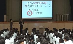写真左上:あいさつ 右上:クイズでつかみはOK 左下と右下:ヒントを出して人物を当てるクイズ