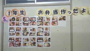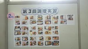 1年生の「家庭基礎」第3回調理実習は「お弁当」でした。自分のお弁当箱に、実習で調理したごはん・鶏の照り焼き・玉子焼き・人参サラダを詰めました。家庭科調理室のある本館3F廊下には、1年生全員の「お弁当」の写真が展示されています。