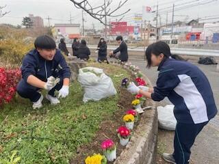 先日、生徒自治会で学校正門の花壇の花の植え替え作業を行いました。