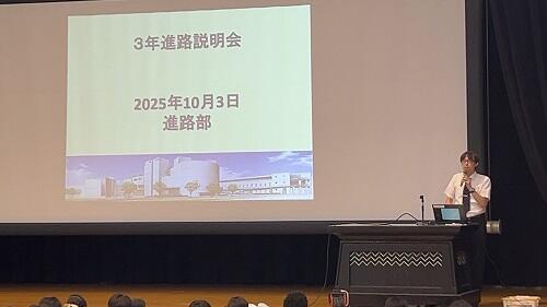 今日の3限目に多目的ホールで3年生が進路説明会を行いましたので見学に行きました。