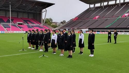 今日、長いの桜スタジアムでラグビーの国際試合、ジャパンXV対オーストラリアA代表の試合が行われましたが、なんと試合前の両国国歌を本校コーラス部と天王寺高校音楽部の生徒で斉唱させていただきました!