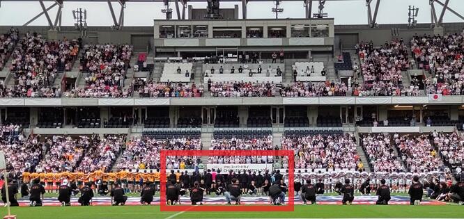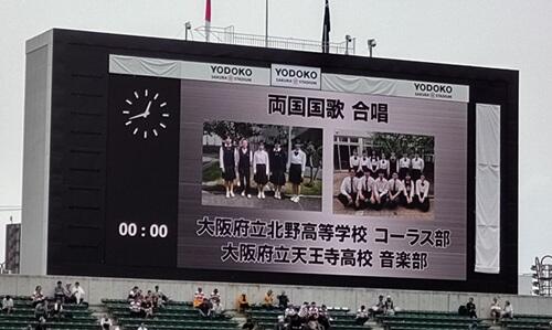 そして本番。左にオーストラリア代表、右にジャパン、真ん中の赤四角で囲ったのが国歌を斉唱する本校と天王寺高校の生徒たち。