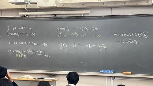 3限目は同じく3年生の化学aの授業を見学に行きました。こちらは昨日見学したクラスと同じ「13族元素」「14族元素」で、アルミニウムやスズとその化合物について勉強していましたが、同じ単元でも教え方には担当の先生それぞれの個性が出ていて非常に面白かったです。また、教え方は違っても独力で答えを見つけられる力を付けるという目的は同じであること、どちらもその目的に向かって真っすぐ進んでいることが感じられて頼もしく感じました。あと、今日の授業の中で、アルマイトを発明したのは日本人であること、鉄道のレールはある程度の長さに溶接してあることなどを知りました。特に線路は並べられたレールがそれぞれ釘やボルトで枕木に固定されているだけだと思っていたので勉強になりました。さらに先生が「作れるようになれば覚えなくてもいい」とおっしゃっておられましたが、まさにその通りだと思いました。