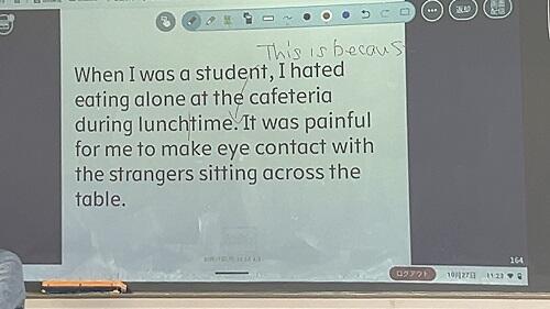 今日の3限目に3年生の英語EXの授業を見学に行きました。授業では大学入試の英作文の問題に取り組んでいました。生徒たちが作った英文はクラスルームでアップ、それを先生がその場で添削してくださいます。自分が作った英作文だけでなく、他の人の英作文も含めてどう表現すればいいのか、どんな表現が不自然なのかがよく分かって大変面白かったし勉強になりました。