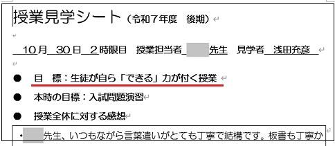 下は私が授業見学後に先生方にお渡ししている「授業見学シート」ですが、昨年から先生方にずっとお願いしているのが「目標:生徒が自ら『できる』力が付く授業」です。まあこの点については本校の場合あまり心配する必要がないかもしれません。というのも、これまで勤めたどの学校よりも北野高校には「自分でできることにこだわる生徒」が多いからです。ということで北野生の皆さん、「自分でできる」ことにとことんこだわって、本当に役立つ力を身に付けてくださいね。