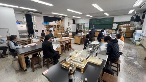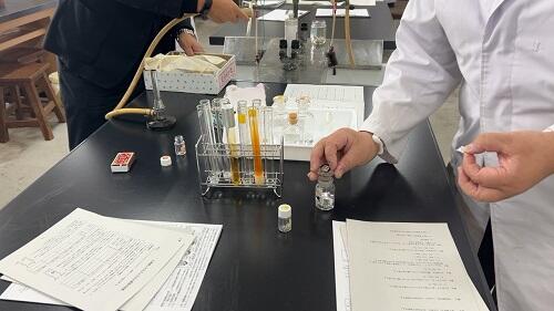 今日の5限目に化学実験室で、他校の先生方にお越しいただいて研究授業を行いました。当初の予定では3年生の授業で、生徒たちが実験を行う様子を見学していただくことになっていたのですが、タイミングの悪いことに当該クラスが学級閉鎖になってしまったため、参加してくださった先生方に生徒役をしていただいて実験を行いました。