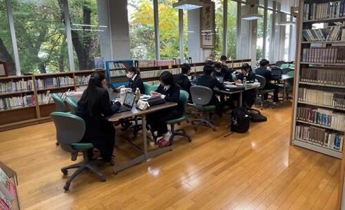 今日の5限目に図書館で授業のあった2年生の国語の課題研究の自習監督に行きました。授業担当の先生がクラス内の何人かの生徒が校外で行う調べ学習に付き添われるということで、元国語教員の私が後を預かることになりました。