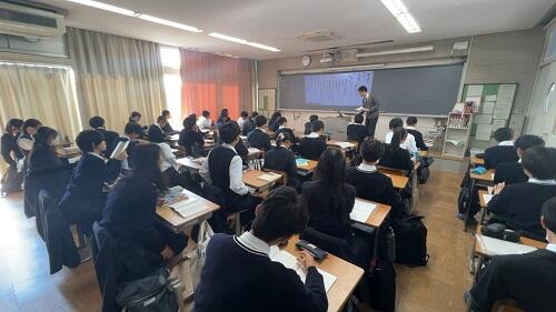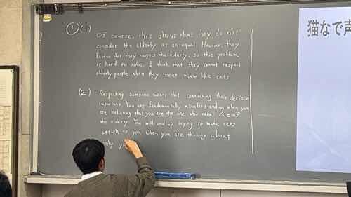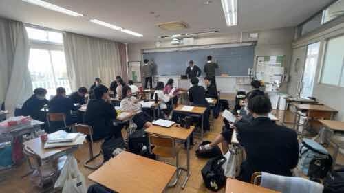 5限目に3年生の英語EXの授業を見学に行きました。この時期ですので内容は問題演習、取り組んでいたのは京都大学をはじめとする国立大学の2次試験英作文問題です。少し面白く感じたのは、英作文の元になっている日本語の文章で、河合隼雄さんや金水敏さんの著作物が使われていました。ちなみに金水敏さんは本校の卒業生で、生徒の中には課題研究でお世話になったものもいると思います。