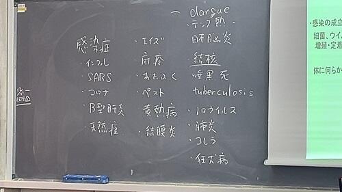 今日の3限目に1年生の保健の授業を見学に行きました。勉強していたのは「感染症」についてです。授業の中で先生が天然痘の根絶について、天然痘ウイルスの立場で話しておられましたが、たしかにそちら側から見たら困った話ですよね。改めていろんな立場からものを見ることを教えていただきました。また「目ばちこ」の話もありましたが、この言葉、本当に久しぶりに聞きました。あと「さだまさし」のお話も面白かったですし、「蚊」の研究のお話も大変面白かったです。さらにインフルエンザに罹ったことがないともおっしゃっておられましたが、私も生まれてこの方、一度も罹ったことがありません。インフルエンザどころか風邪も滅多にひきません。これも先生がおっしゃっておられた通り、お茶をよく飲むお陰かもしれませんね。ということで生徒の皆さん、誰か風邪に効く抗菌薬を発明してくれませんか。これが発明できたら多分ノーベル賞をいただけますよ。そうなれば北野高校に横断幕を掲げてもらえますよ?