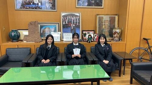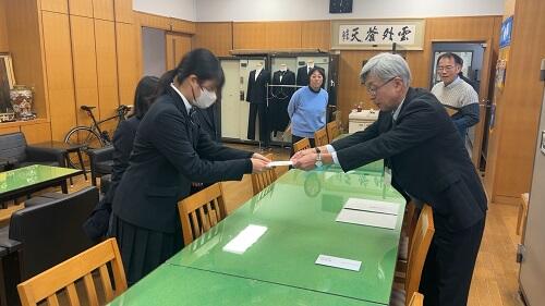 今日の昼休みに校長室で、12月23・24日に東京大学で行われる即興型英語ディベート全国大会に出場する2年生Uさん、1年生TさんとSさんへの激励金授与式を行いました。これまでと同じく六稜同窓会からの分を千種事務局長から、PTAからの分を私から手交し、千種事務局長から激励の言葉をいただいた後、出場する三人に抱負を語ってもらいました。