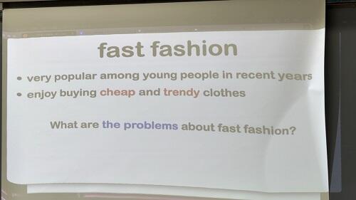 5限目も同じく2年生の英語EXの授業を見学に行きました。内容も同じく全部否定と部分否定でしたが、ワークの進め方が全く違っていました。でも生徒たちが楽しそうに学んでいる姿はまったく変わらないのが面白かったです。例文に2年生の担任の先生方のお名前が出てきたり、中に一人だけお笑い芸人の方のお名前が混じっていたりしているのも面白かったです。あと「fast fashion」が出てきましたが、これを聞いても何となく分かるだけで正確に何を指しているのかよく分かりませんでした。生徒たちはきちんと理解できているようでしたが、これがいわゆる「ジェネレーション・ギャップ」というものですか。それとも単に私が勉強不足なだけでしょうか。(笑)