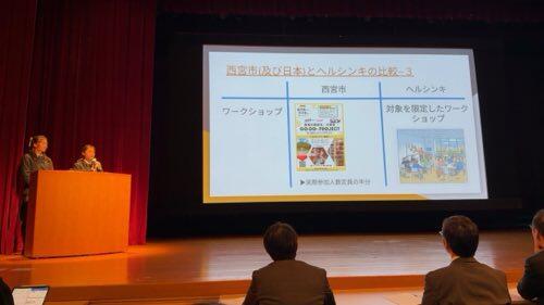 我が北野高校は5番目、KさんとSさんが「図書館×市民参加」というテーマで発表を行いました。西宮市に建設予定の市民図書館に関して、市民の政治参加が盛んなヘルシンキの図書館参考に、市民にとって身近な図書館を創るには何をどうすればいいか考察されていました。その考察の内容は実際に西宮市に提言して受け入れてもらえたそうですが、本当にこれからのいろんな場所での街づくりに資する発表でした。またスライドが非常に見やすく作られありましたし、随所に伝えるための工夫も施されていました。