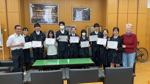 ホームルームや大掃除が終わってから、校長室で英語のX-Readingで優秀な成績をあげた1年生の表彰を行いました。最も多く英語の本を読んだのは左端のY君で15000語でした。だいたい毎日2,3冊読めば達成できるそうですが、そうそうできるこtではありませんね。何はともあれ、他校性に比べて英語力が高い北野生の中でも特に努力を重ねて表彰された生徒たちです。本当によく頑張りました。素晴らしいです。