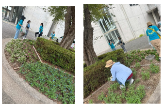 また、急に涼しくなったためなのか、枯れ葉が多く落ちてきている図書館の森の小径や、校門から校舎へ向かう通路の掃き掃除、植え込みの草取りなども行いました。