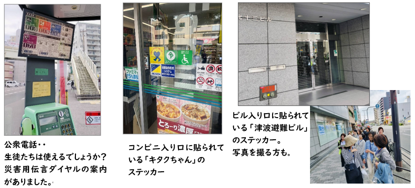 その他、避難所となる小学校や高台、何かの折に避難できそうな店舗の駐車場、公衆電話などの情報を皆さんで共有しながら歩きました。