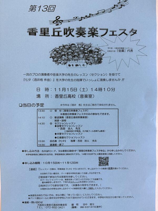 ◉当日は、香里丘高校吹奏楽部が日頃招いている、一流のプロ奏者の指導を受けていただきます。 世界的作曲家で香里丘高校吹奏楽部OBでもある酒井格先生作曲の「七夕」を合奏する予定です。