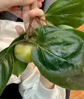 まだ実っていない緑色の柿は、校庭の柿です。やっと涼しくなったので、これからオレンジ色に実るでしょう。